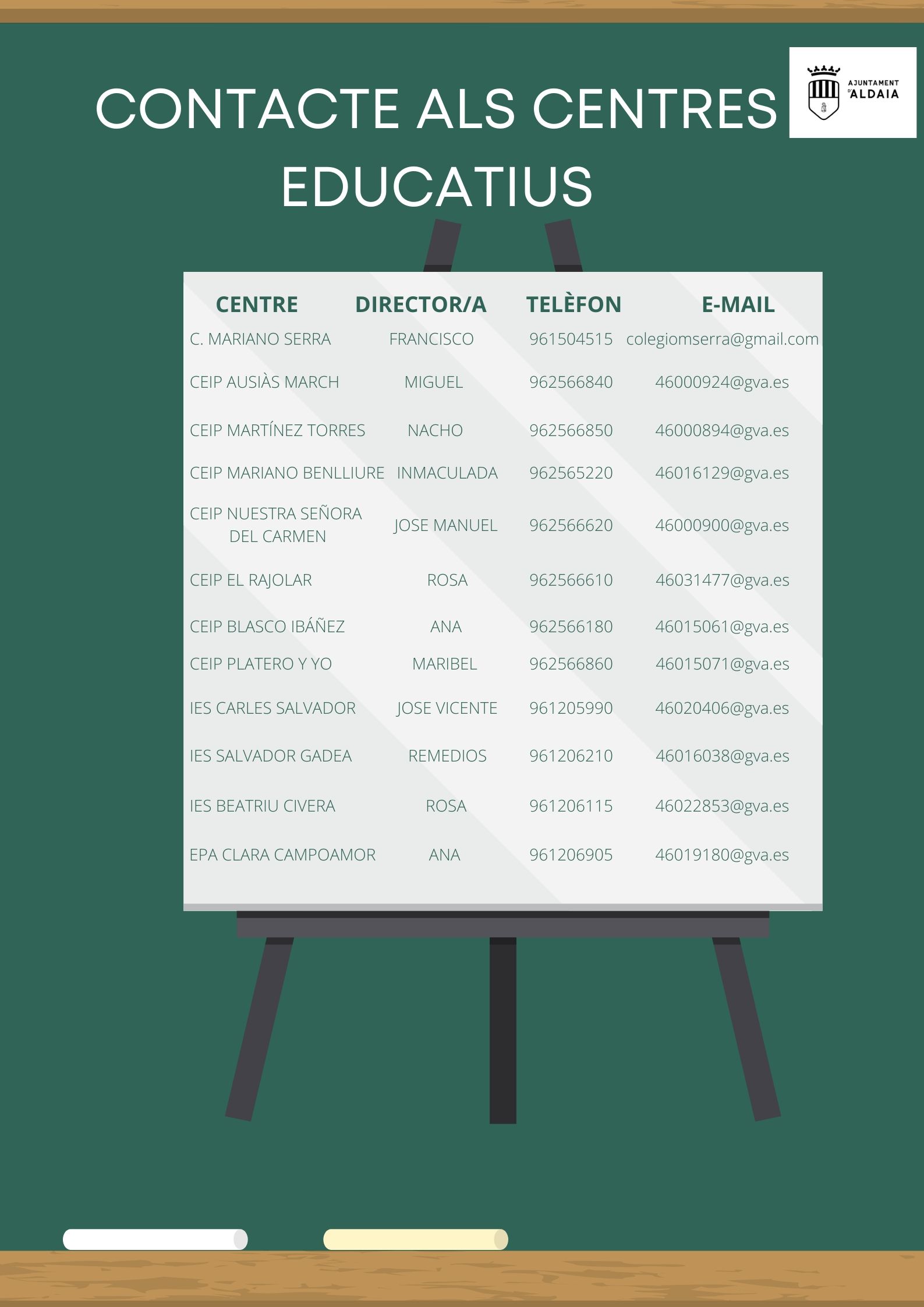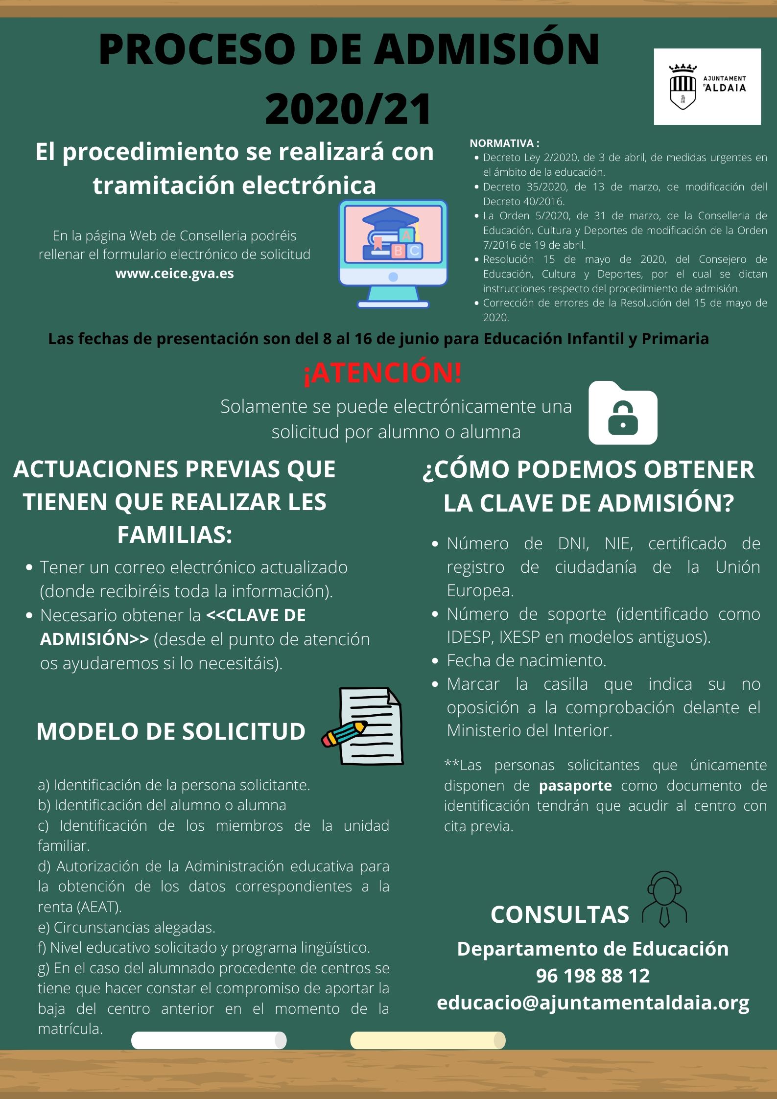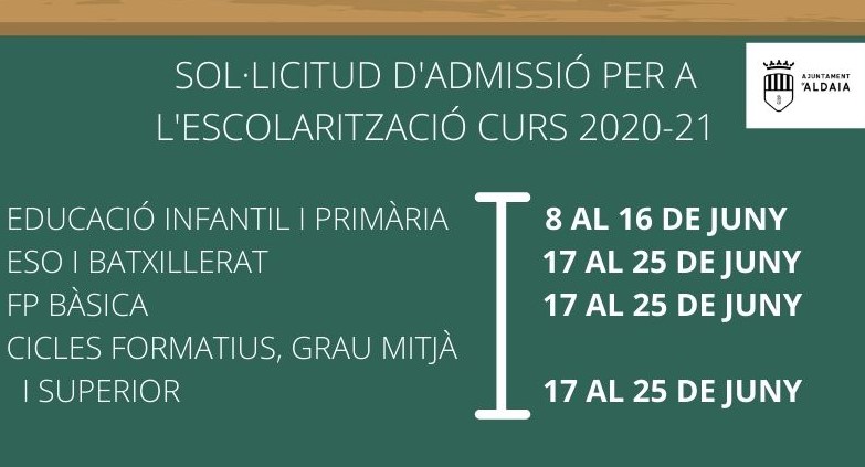 La escolarización es un proceso que engloba varias fases: solicitud de admisión, duplicidades, baremación, reclamaciones, listas definitivas y matrícula. Por este motivo, desde el Ayuntamiento de Aldaia queremos posar a vuestra disposición toda la información que necesitáis para hacer efectiva la escolarización de vuestros hijos e hijas para el próximo curso 2020-2021. En esta página podéis informaros de todo el procedimiento de una manera fácil y directa.