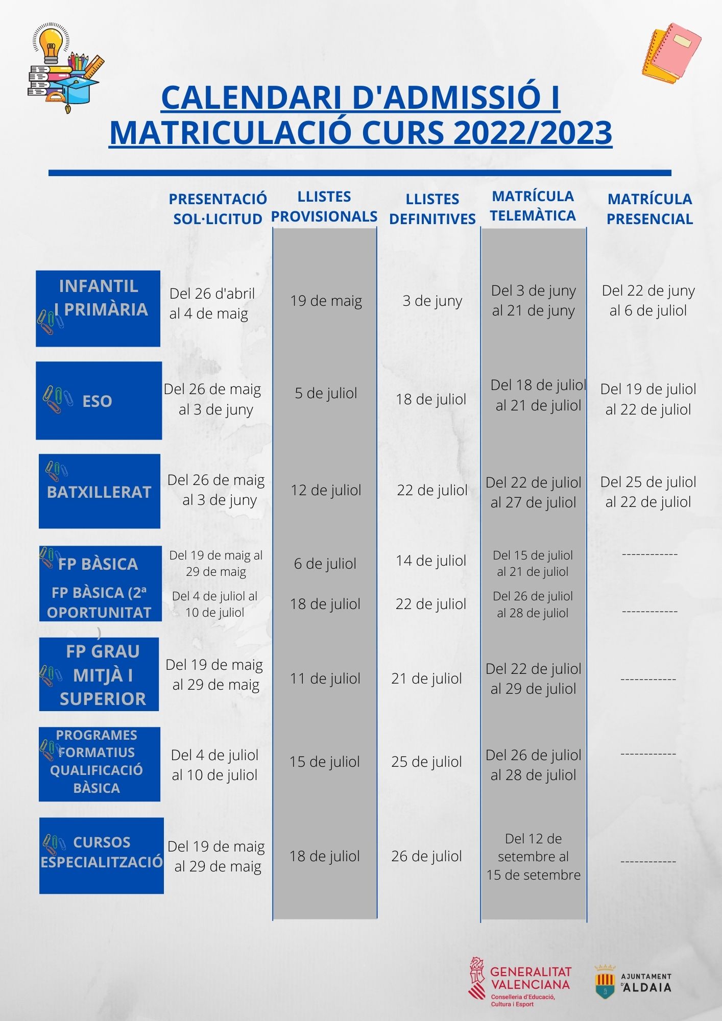 A continuación os adjuntamos el calendario de presentación de solicitudes y proceso de matriculación.