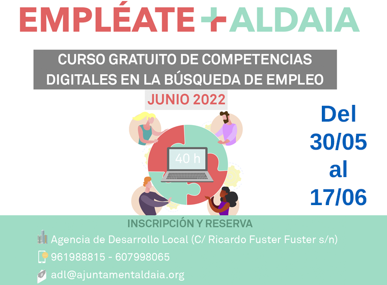L'Agència de Desenvolupament Local d'Aldaia iniciarà el pròxim mes de juny un curs gratuït dirigit a persones desempleades destinat a crear una estratègia de cerca d'ocupació personalitzada.