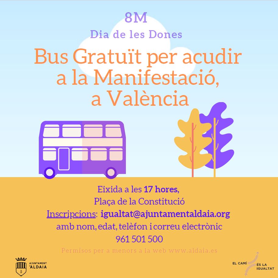 La concejalía de Igualdad del Ayuntamiento de Aldaia pose a disposición de la ciudadanía un autobús para acudir, juntos, a la manifestación del domingo 8 de marzo, Día de las Mujeres, en València.