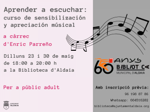 - El dilluns 23 s'inicia este curs en la Biblitoeca Municipal, en horari de 18:00 a 20:00 h. Per a públic adult. Aforament limitat. Inscripció prèvia: telefonant al 96 198 87 86 enviant un whatsapp al 664 51 62 02 enviant un email a biblioteca@ajuntamentaldaia.org