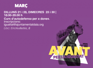 - Curs d’autodefensa que s’impartirà al carrer Encreullades nº 8 els dilluns 21 i 28, i els dimecres 23 i 30, en horari de 18.30 h a 20.30 h. Inscripcions en el correu d’Igualtat (igualtat@ajuntamentaldaia.org).