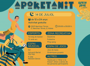 - El servei de Joventut d'Aldaia torna a apostar per APOKETANIT enguany, una proposta d'oci alternatiu nocturn dirigida a la gent jove del municipi amb activitats esportives, culturals i musicals gratuïtes. El pròxim dijous 14 de juliol, en horario de 20.00 h a 00.00 h, al CEIP Martínez Torres. Entrada lliure
