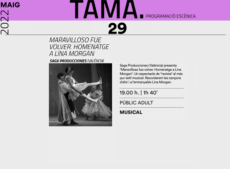 • Homenatge a Lina Morgan al TAMA de la Saga Producciones. Un espectacle de "revista" al més pur estil musical. Recordarem les cançons d'ahir i a l'entranyable Lina Morgan.