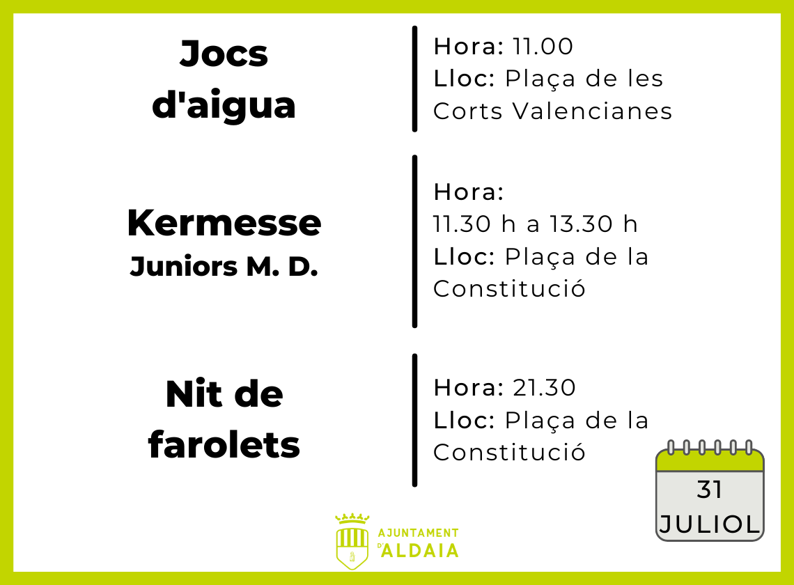 - Jocs d'aigua: 11.00 h, a la Plaça de les Corts Valencianes.