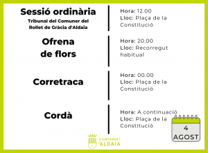 - Sessió ordinaria pública del Tribunal del Comuner del Rollet de Gràcia d'Aldaia en la plaça de la Constitució, a les 12.00 h.