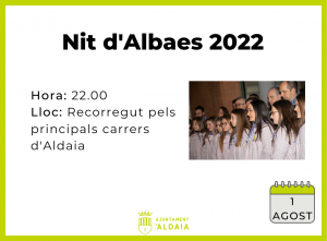 La nit de l'1 d¡agost tindrà lloc, a les 22.00 h, la tradicional Nit d'Albaes, organitzada pels Clavaris del Crist 2022, amb recorregut pels principals carrers d'Aldaia.