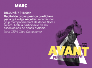 • El CEPA Clara Campoamor acollirà el dia 7 a les 18.00 h un recital de prosa poètica a càrrec del grup d’empoderament de dones Som i Teixim, en col·laboració amb les associacions de dones municipals.