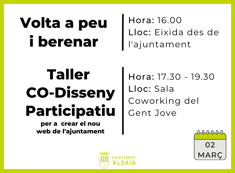 - Apunta't al taller de CO-Disseny i col·labora amb el nou portal municipal. En horari de 17.30 h a 19.30 h a la Sala de Coworking del Gent Jove. Inscripcions: https://forms.gle/URZFi5rqazNdRPkH6