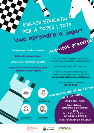 Finalidad: La Actividad de AJEDREZ EDUCATIVO tiene como finalidad desarrollar la atención, la concentración, la creatividad y la imaginación, así como potenciar la capacidad del razonamiento lógico-matemático. Pretende mejorar el rendimiento académico, cubrir las desigualdades a nivel educativo que se hayan podido acentuar con esta situación sanitaria, a la vez que ayudar a la conciliación familiar y promover el principio de igualdad de oportunidades en el ejercicio del derecho a la educación.