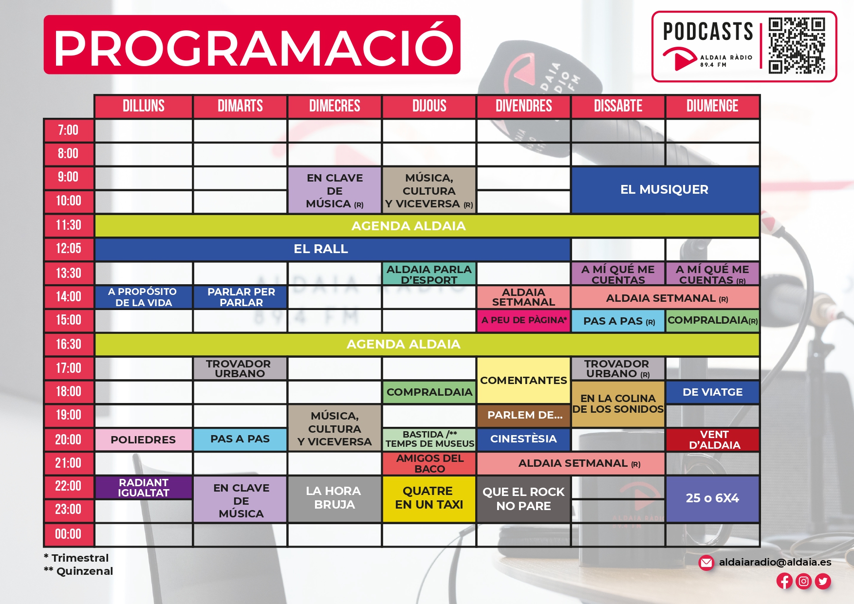 Desde 2020 Aldaia Ràdio, la 89.4 de la FM, vuelve a ofrecer su parrilla rellena de programas propios y de colaboradores y colaboradoras que hacen radio, viven a las olas, fomentan conversas interesantes, de entretenimiento, cultura e información de proximidad a través de nuestra emisora municipal. También encontramos actualmente espacios producidos por radios públicas vecinas de la Xarxa d'Emissores Municipals Valencianes, a la que pertenece Aldaia Radio.