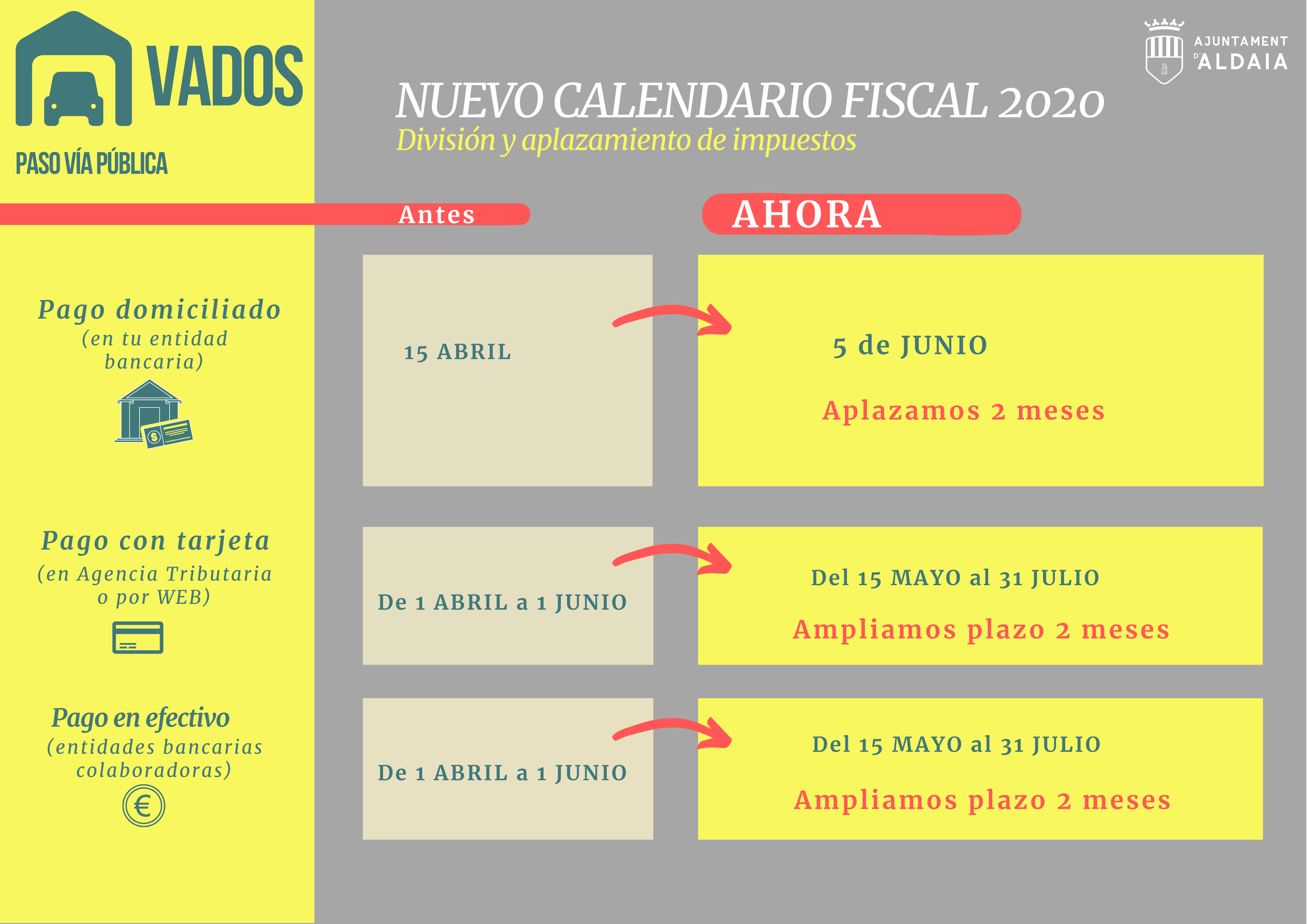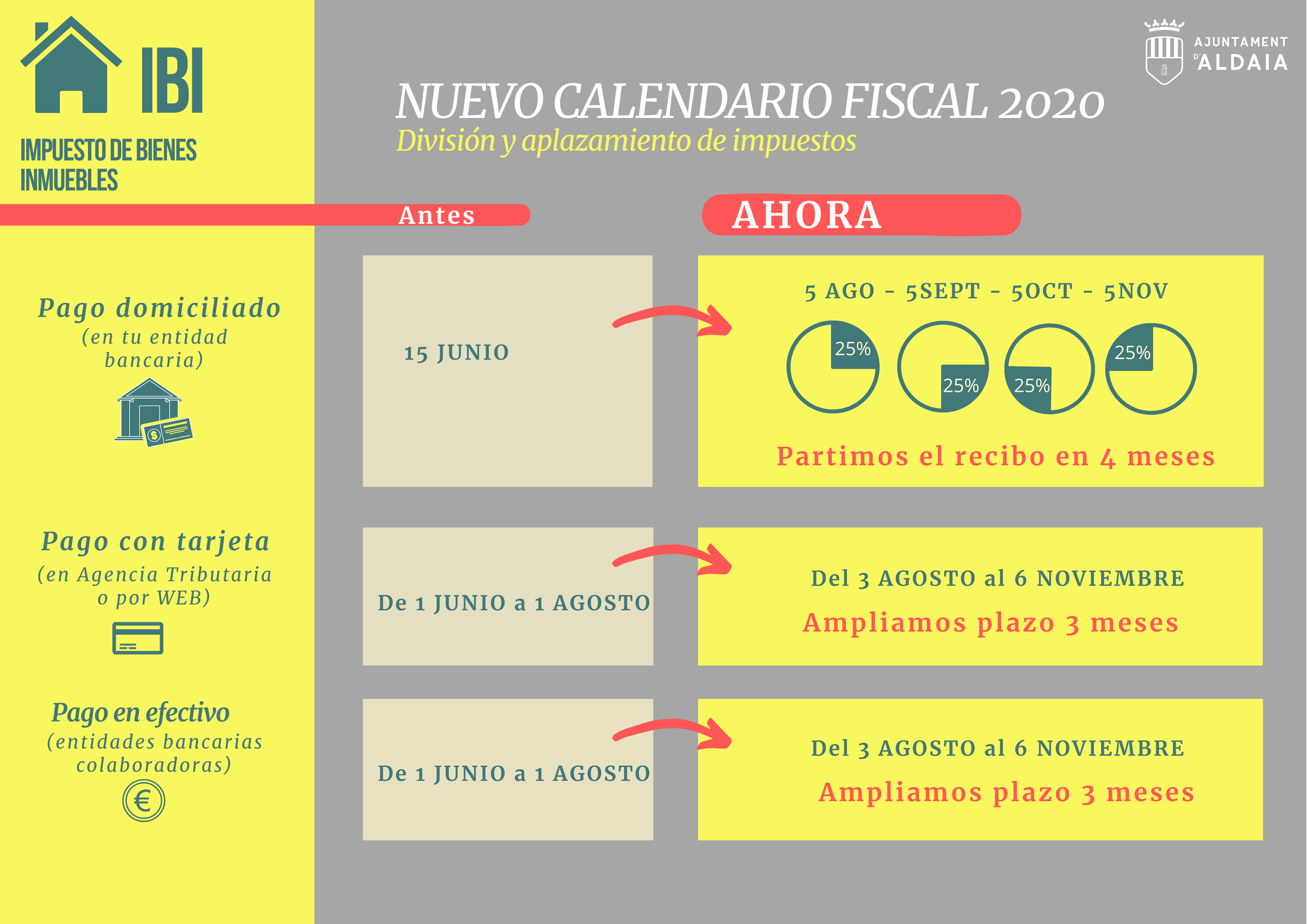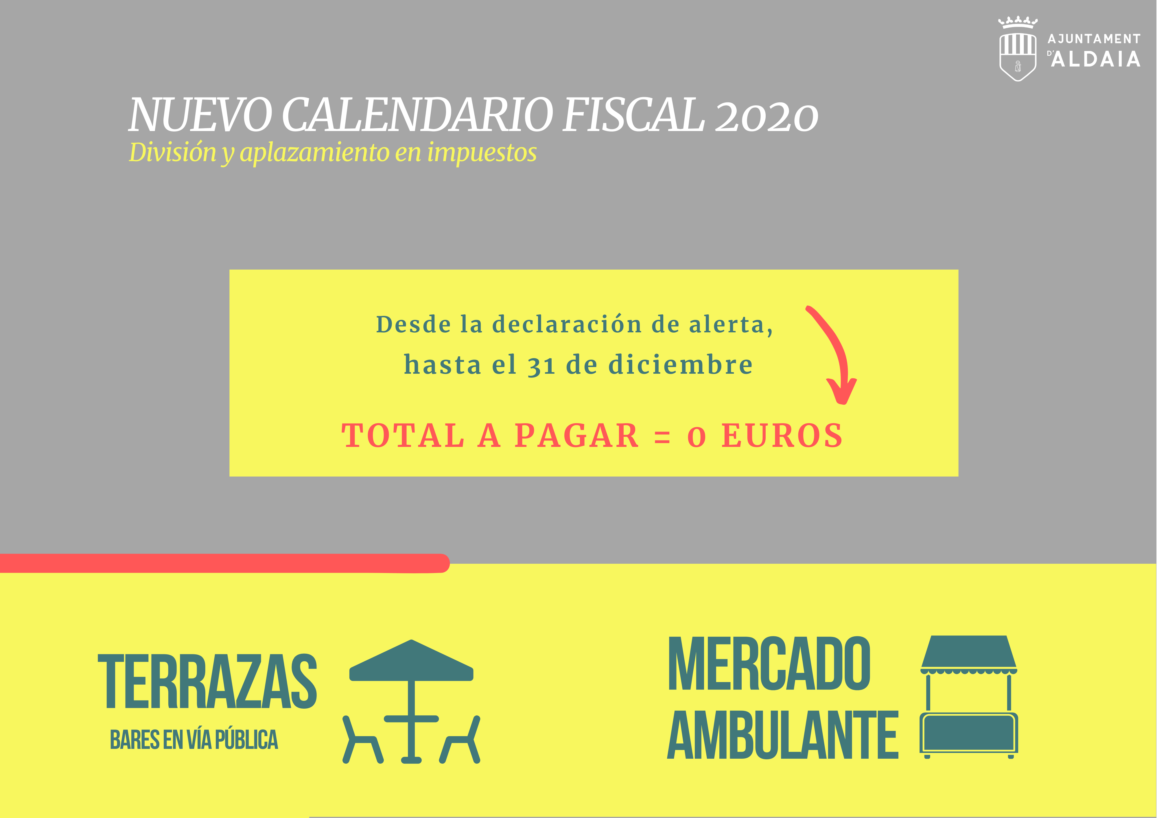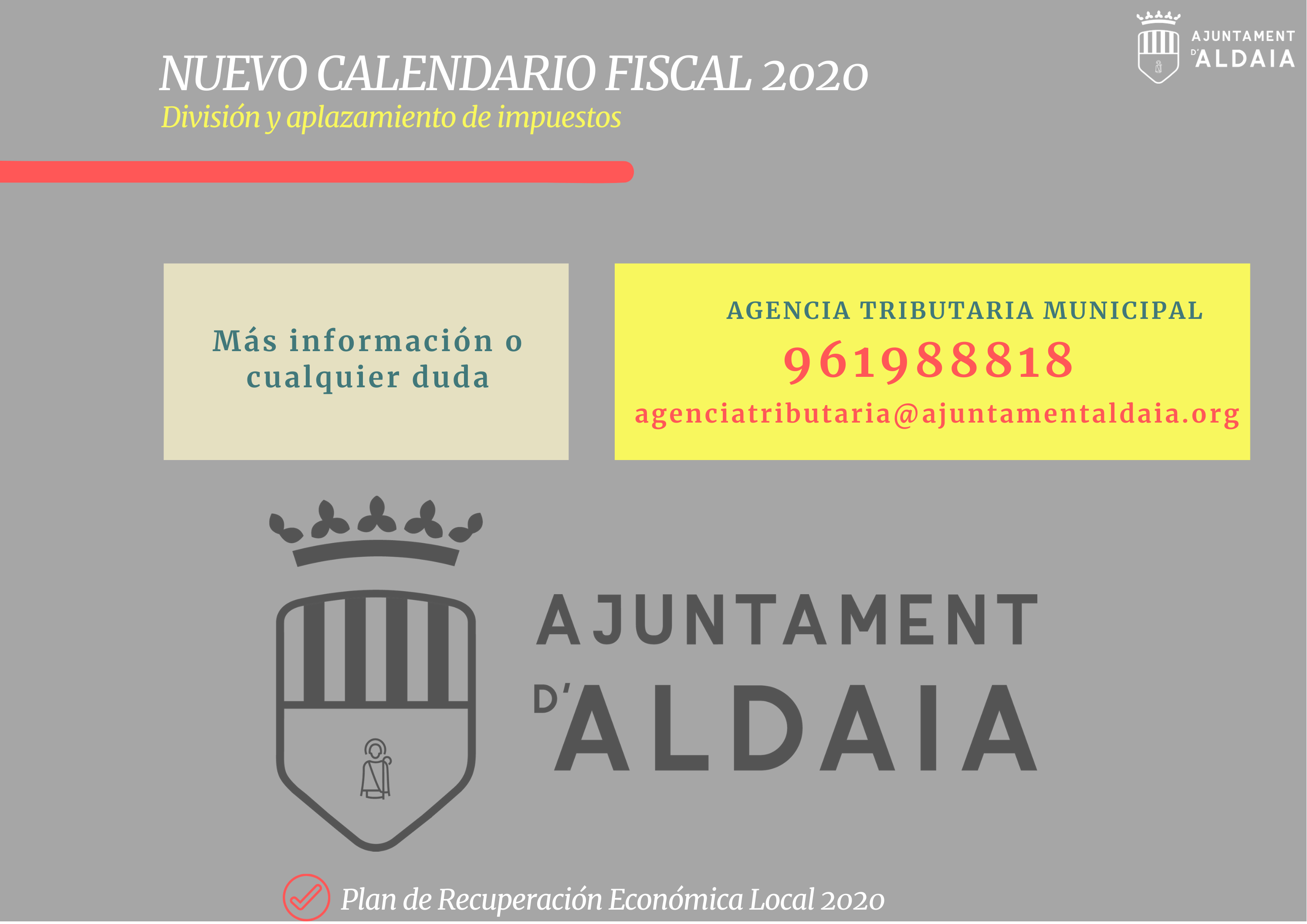 L'Ajuntament d'Aldaia ha aprovat esta setmana la modificació del calendari fiscal per a l'any 2020 amb l'objectiu de facilitar als contribuents el compliment dels seus deures tributaris i pal·liar, dins de les competències municipals l'impacte econòmic de la pandèmia causada pel COVID-19.