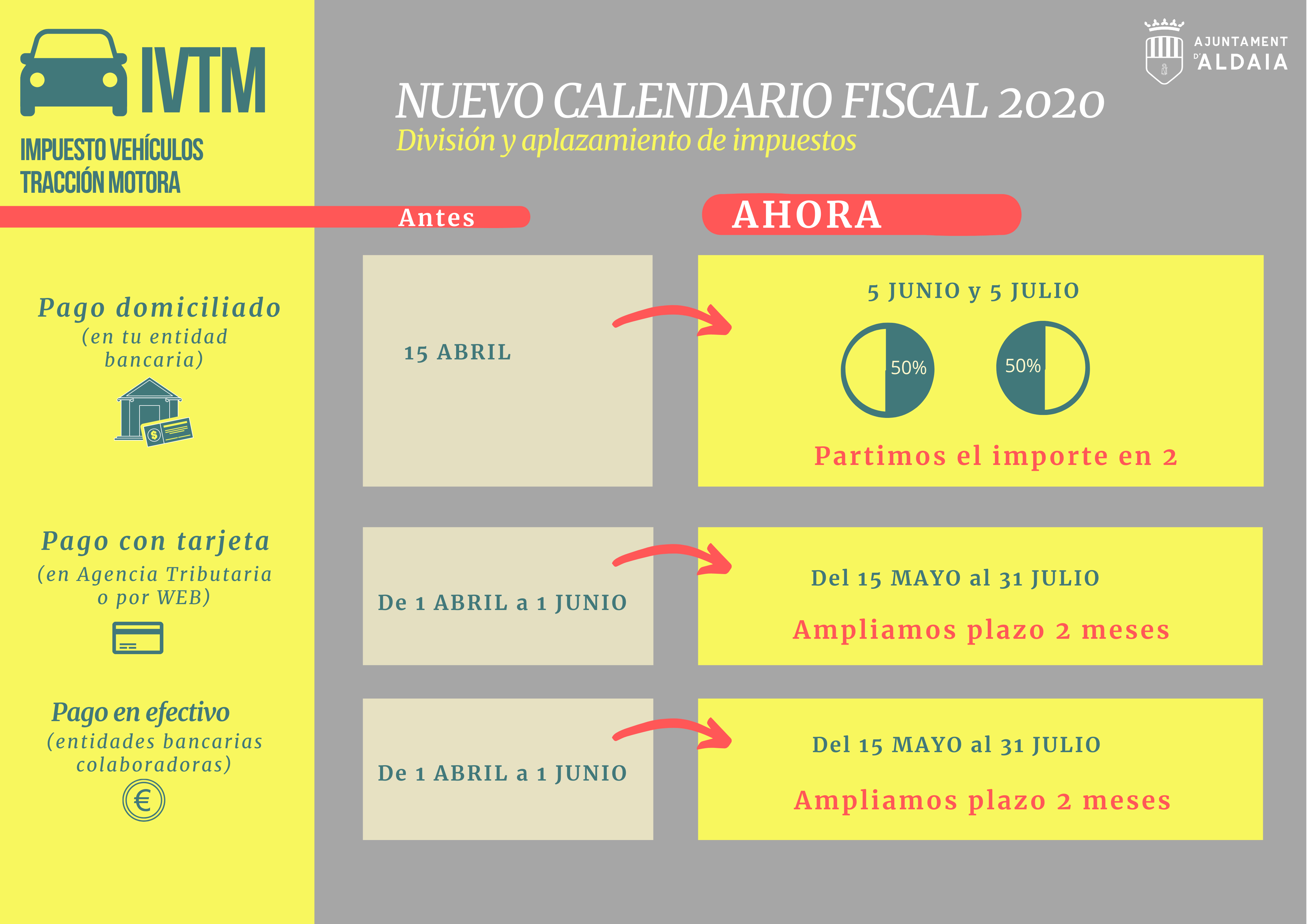 L'Impost de Vehicles de Tracció Mecànica (IVTM), també s'adapta a les circumstàncies provocades pel Coronavirus. Així, el pagament “domiciliat” amb data 15 d'abril, passarà a abonar-se el rebut, de manera automàtica per a tots els veïns en dos parts, la primera el 5 de juny i la segona el 5 de juliol.