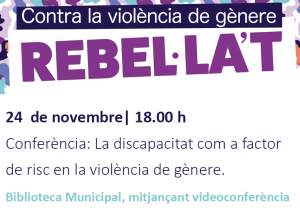 Conferència: La discapacitat com a factor de risc en la violència de gènere, a càrrec de Vicky Bendito Romero, periodista i defensora dels drets de les persones amb discapacitat i amb malalties rares, i Premi Top 100 Dones Líders a Espanya 2020 en la categoria de Tercer Sector i Impacte Social. Dimecres 24 de novembre a la Biblioteca Municipal d’Aldaia, mitjançantvideoconferència.