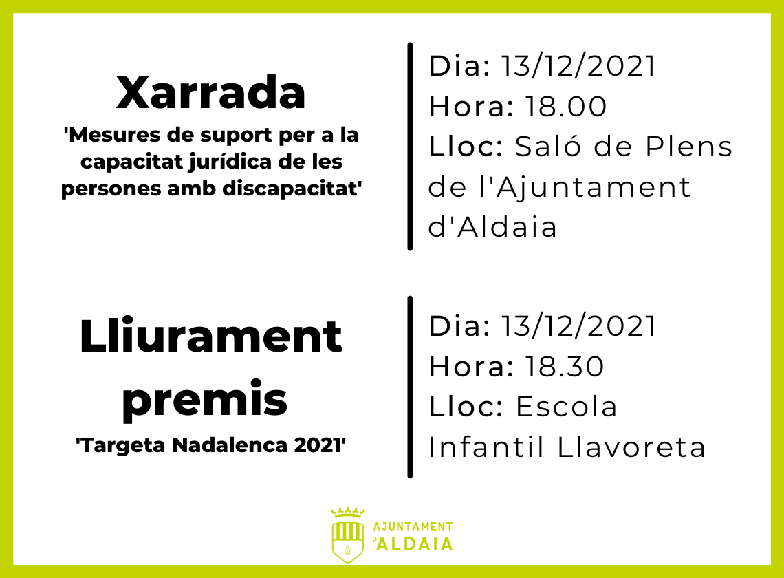 • Xarrada ‘Mesures de suport per a la capacitat jurídica de les persones amb discapacitat’ al Saló de Plens de l'Ajuntament d'Aldaia, a càrrec de la tècnica jurídica de Serveis Socials Empar López Aigües, i que començarà a les 18.00 h.