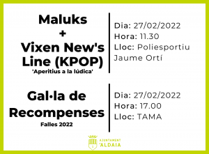 - Maluks + Vixen's New Line (KPOP) dins dels 'APERITIUS A LA LÚDICA' al Poliesportiu Jaume Ortí, les portes s'obrin a les 11.30 h. Entrades a: www.notikumi.com/?q=APERITIUS+A+LA+L%C3%9ADICA