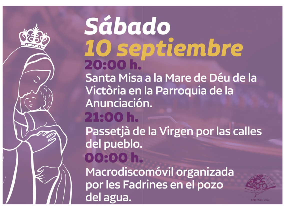 • Santa Missa a la Mare de Déu de la Victòria en la Parròquia de l'Anunciació (20:00 h). Passetjà de la Verge pels carrers del poble (21:00 h). Macrodiscomòbil organitzat per les Fadrines en el pou de l'aigua d'Aldaia (24:00 h).
