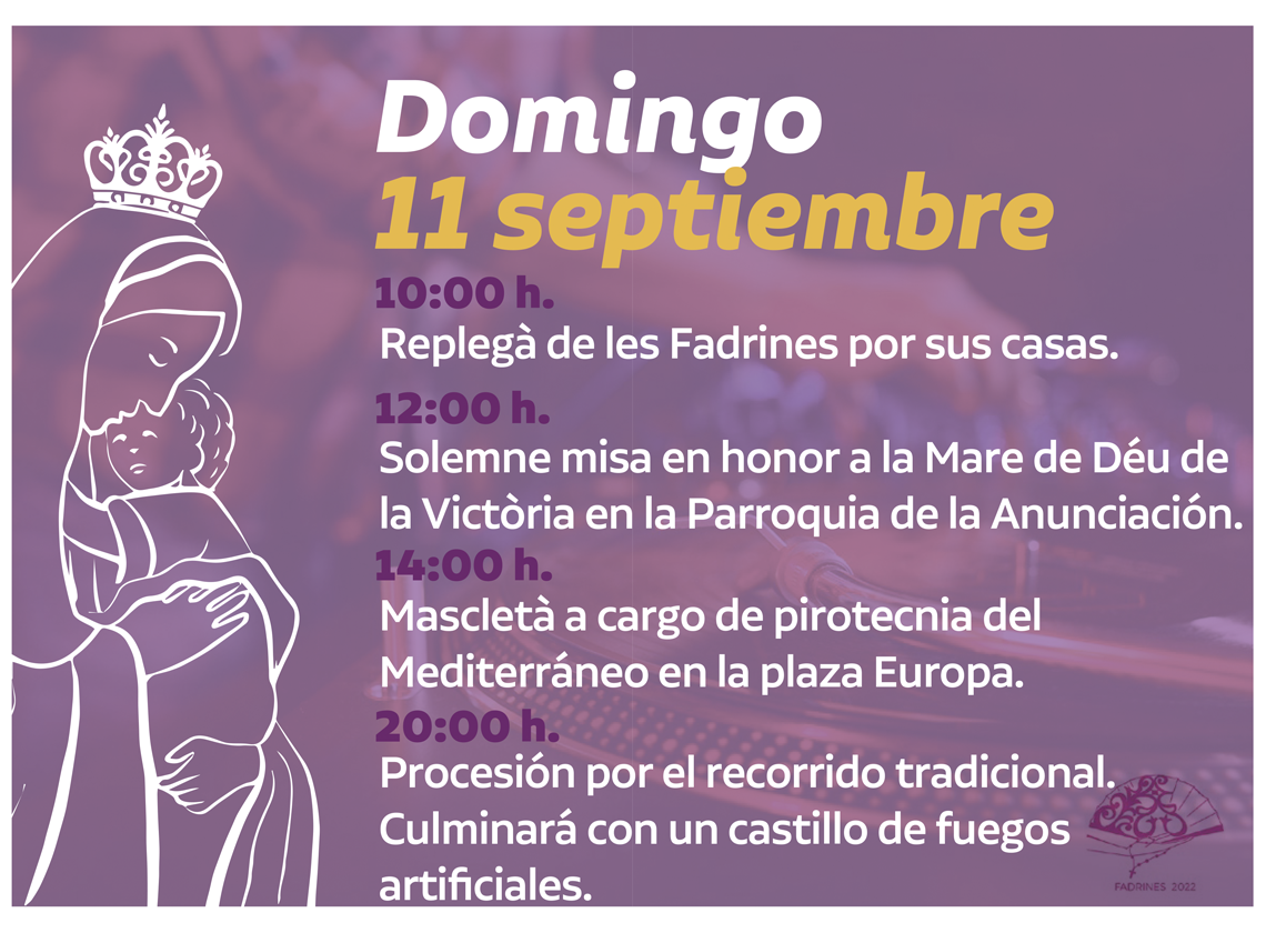 - Replegà de les Fadrines per les seues cases (10:00 h). Solemne missa en honor a la Mare de Déu de la Victòria en la Parròquia de l'Anunciació (12:00 h). Mascletà a càrrec de la pirotècnia del Mediterráneo en la plaça Europa (14:00 h). Processó pel recorregut tradicional, culminant amb un castell de focs artificials (20:00 h).
