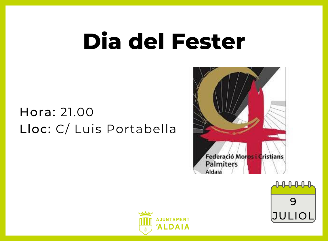 Celebració de la Federació de Moros i Cristians "Els Palmiters" d'Aldaia que tindrà lloc al carrer Luis Portabella, a les 21.00 h, amb sopar, festa popular i discomòbil.