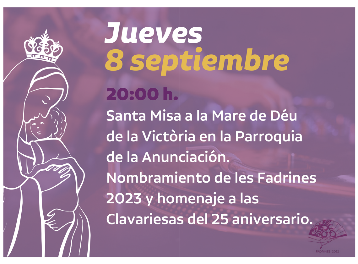 Santa Missa a la Mare de Déu de la Victòria en la Parròquia de l'Anunciació. Nomenament de les Fadrines 2023 i homenatge a les Clavariesses del 25 aniversari.