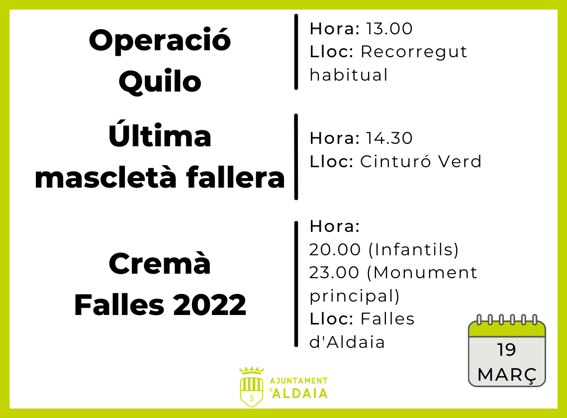 Tradicional Operació Quilo a les 13.00 h, última mascletà fallera a les 14.30h i cremà dels monuments fallers a les 20.00 h (infantils) i a les 23.00 h (principals).