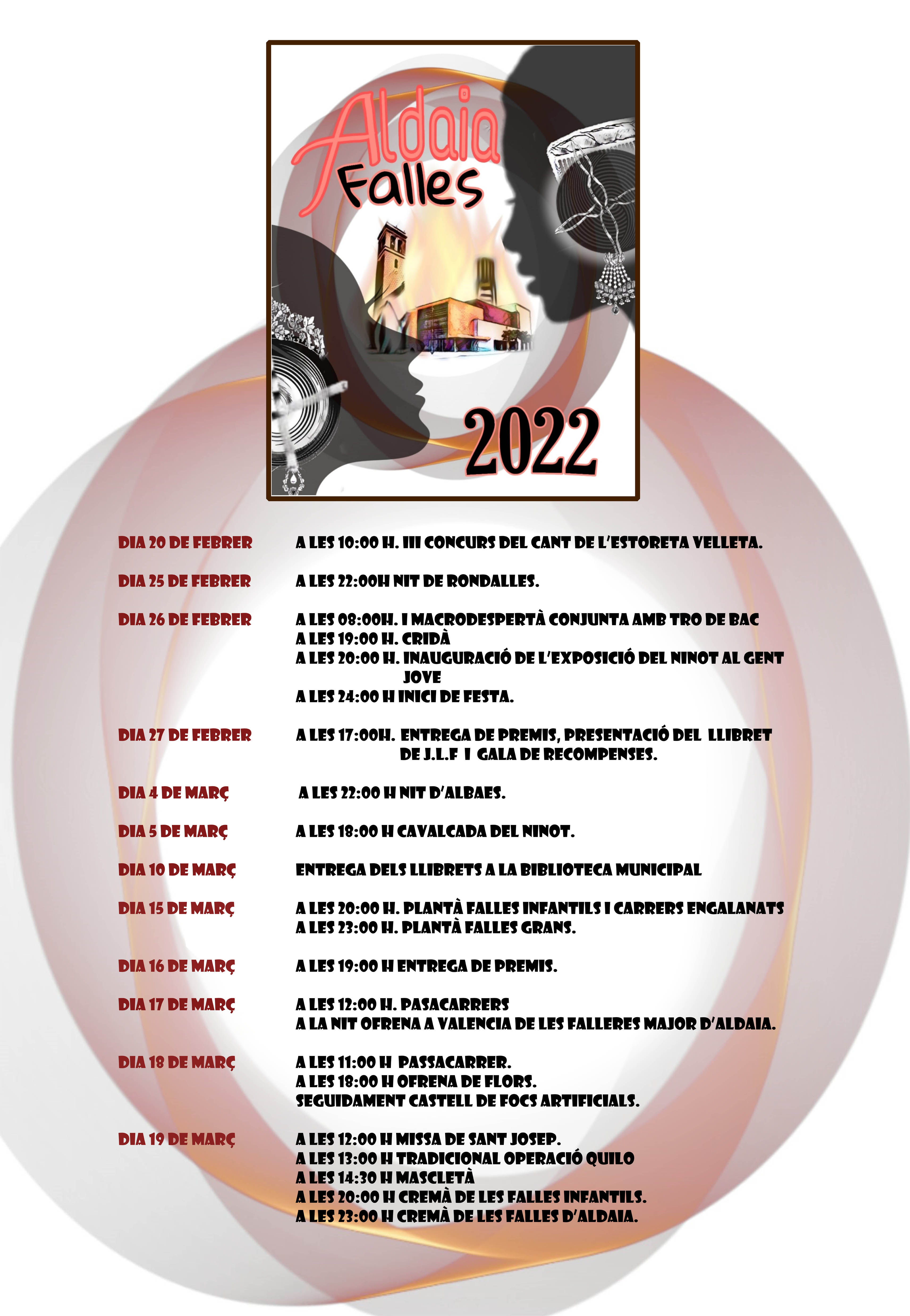 El divendres 4 de març, a les 22.00 h, Aldaia s’omplirà de música i ambient faller amb la Nit d’Albaes, ambient que no abandonarà els carrers del municipi, ja que el dissabte 5, a les 18.00 h, els veïns i veïnes podran disfrutar de la Cavalcada del Ninot. L’entrega dels llibrets serà al llarg del dia 10 a la Biblioteca Municipal.