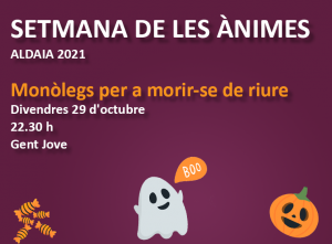 El divendres 29 d'octubre, a les 22.30 h al Gent Jove (Aforament controlat). Esta nit tindrem còctels aborronadors sense alcohol. L'Unitat de Prevenció Comunitària de Conductes Addictives d'Aldaia promou la campanya "Diversió sense alcohol" dins de la Setmana de les Ànimes Aldaia 2021. Les persones assistents als monòlegs, podran gaudir de manera gratuïta de còctels sense alcohol a càrrec de @tubarman.es.