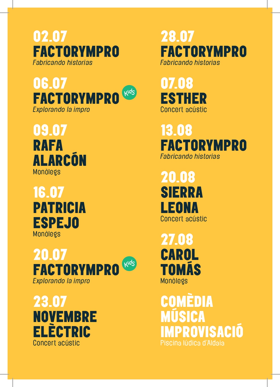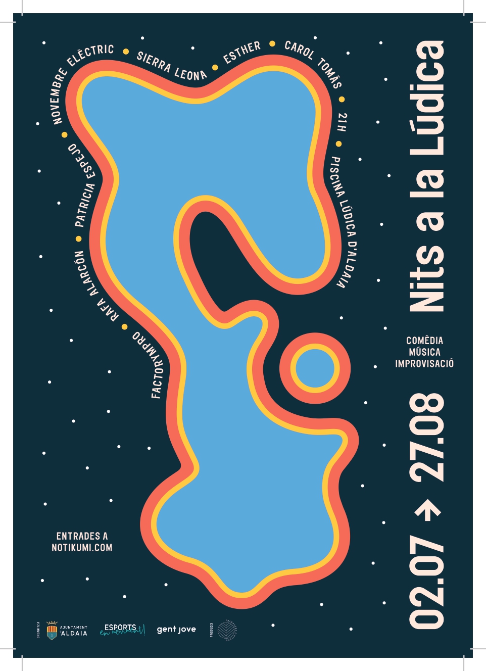 Un cartell d’alt nivell i paritari que aposta per artistes valencians que podrem gaudir a la Terrassa de la Piscina lúdica municipal. I de fet, podrem admirar especialment una de les insígnies artístiques d’Aldaia, la companyia d’improvisació teatral Improu Teatre.
