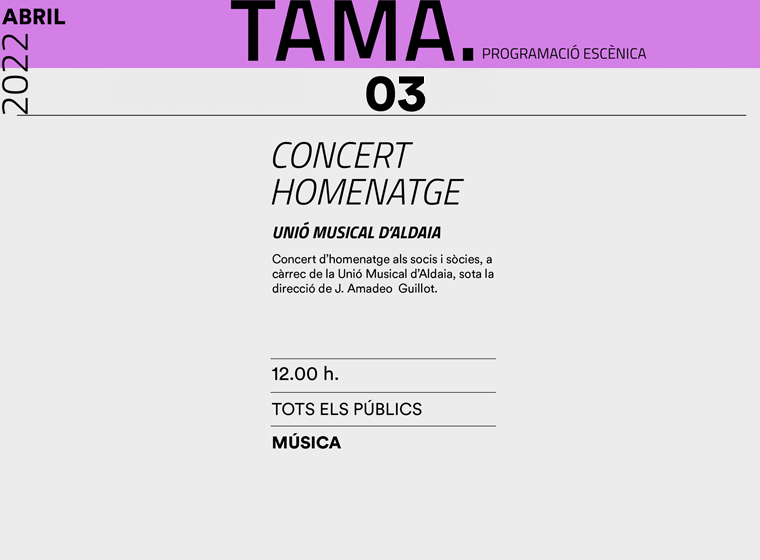 Concert d’homenatge als socis i sòcies, a càrrec de la Unió Musical d’Aldaia, sota la direcció de J. Amadeo Guillot. Pròxim 3 d'abril, a les 12.00 h al TAMA.