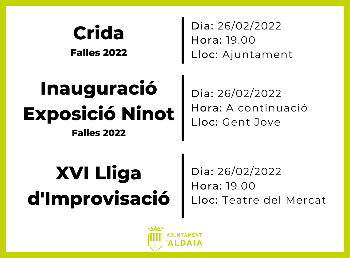 - Crida de les Falles 2022 d'Aldaia a les 19.00 h, i a continuació inauguració de l'Exposició del Ninot d'enguany al Gent Jove.