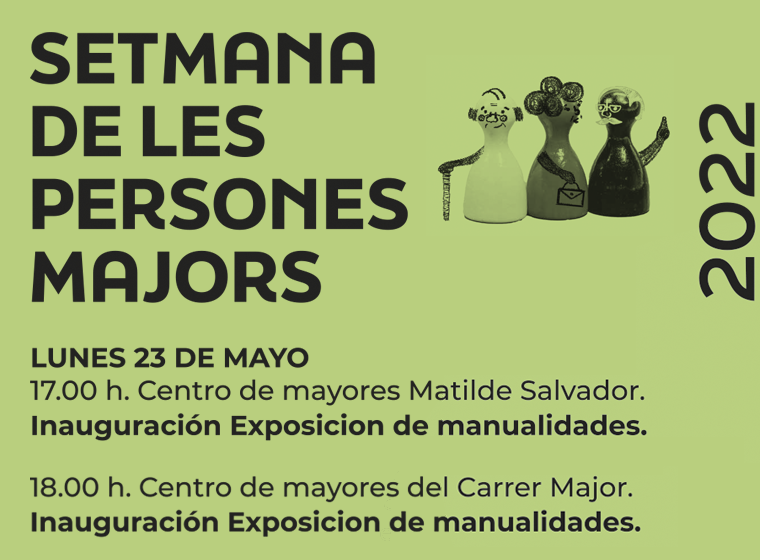 • Inauguració de les exposicions de manualitats als Centres de Majors d'Aldaia, a les 17.00 h (Matilde Salvador) i 18.00 h (Carrer Major).