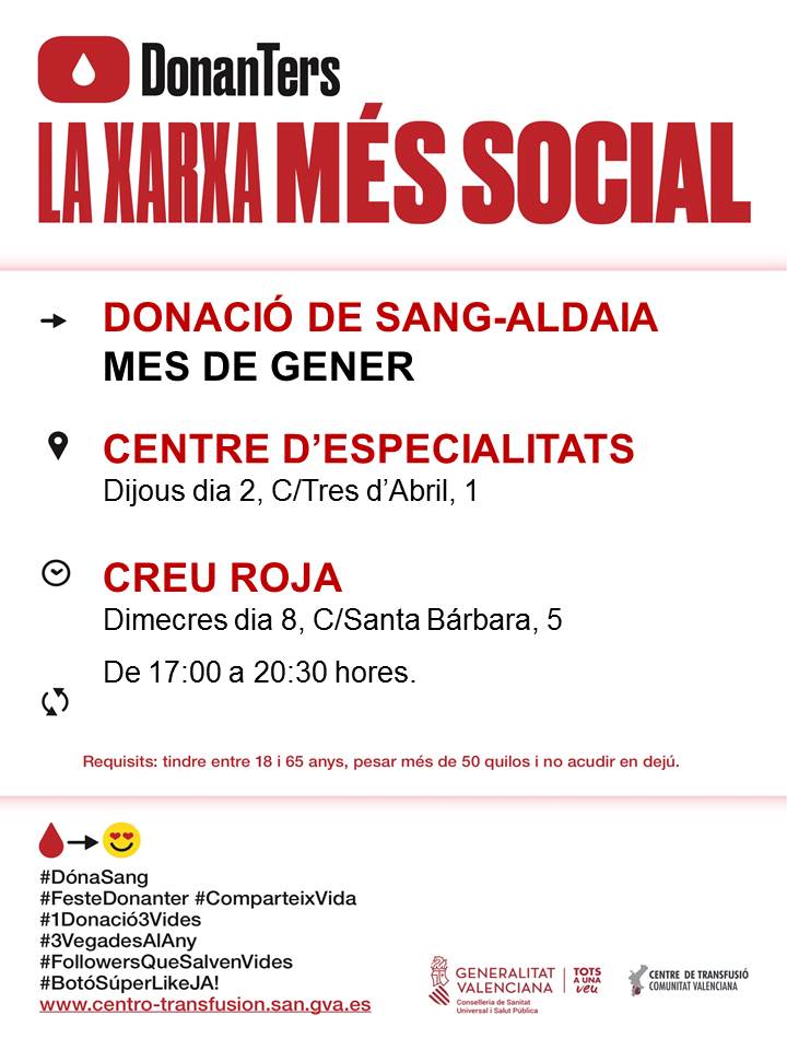 La donació de sang al mes de gener, en Aldaia, es durà a terme els dies dijous 2 de gener (C/ Tres d'Abril, 1) al Centre d'Especialitats, i el dimecres 8 de gener (C/Santa Bárbara, 5) en Creu Roja. Entre les 17 i les 20:30 hores.
