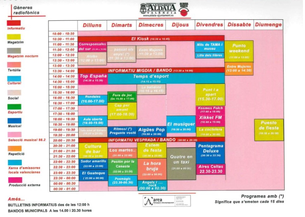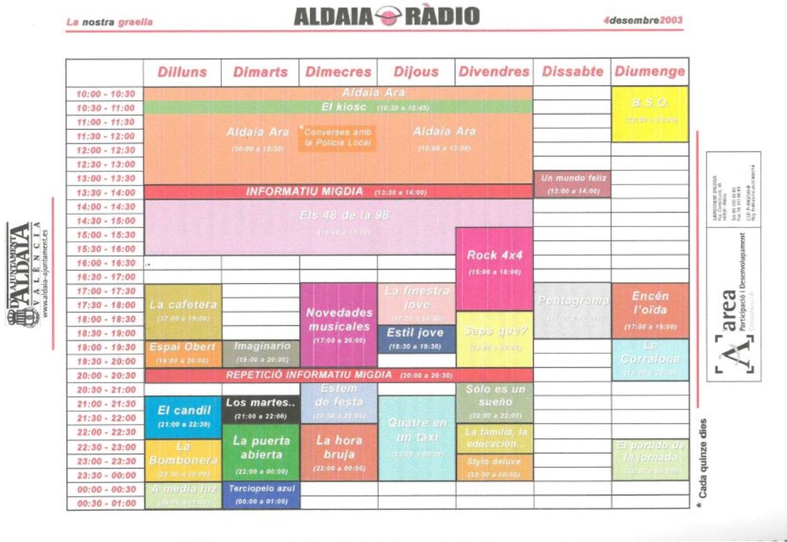 Així, tot seguit, podem observar una evolució i varietat d'espais en les graelles de programació que va arribar a oferir Aldaia Ràdio en la seua primera etapa d'història.